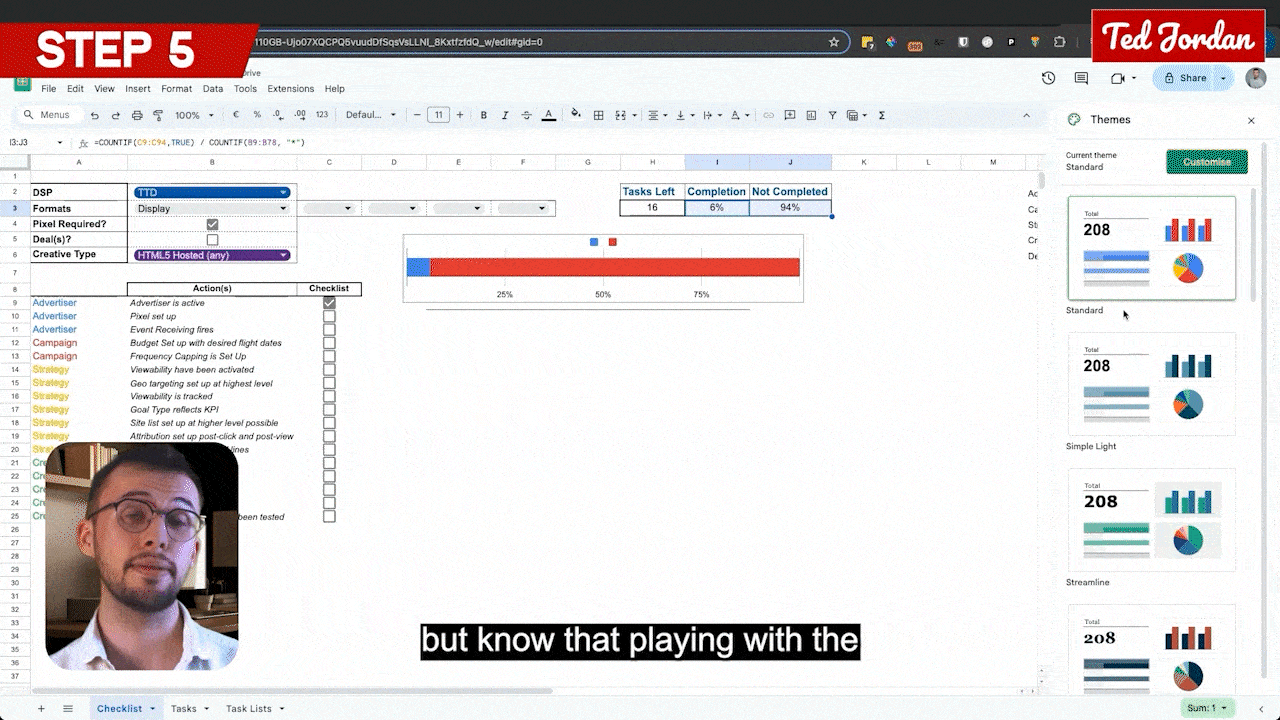 Bring data to life by adding interactivity with tick boxes and drop-downs. Customize your sheets with themes, create unique charts, and add navigational buttons for a smooth user experience.